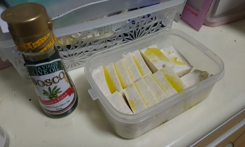 出来上がった豆腐にオリーブ油を掛けて出来上がり!