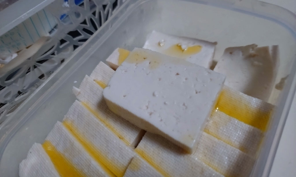 この豆腐、約90%が水分であり、この水分を取ることでチョッと変わった味が楽しめる(まあ、もともと味は薄いんだけどね)