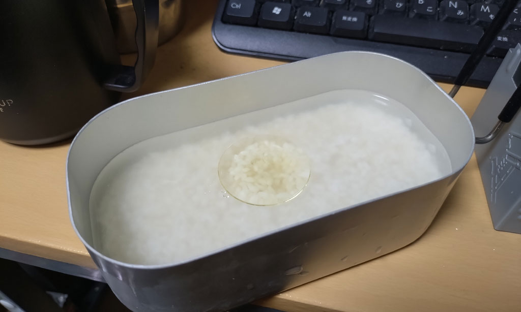 こないだ百均で買った500円のメスティンを使った炊飯を、家のテーブルで作ってみた。