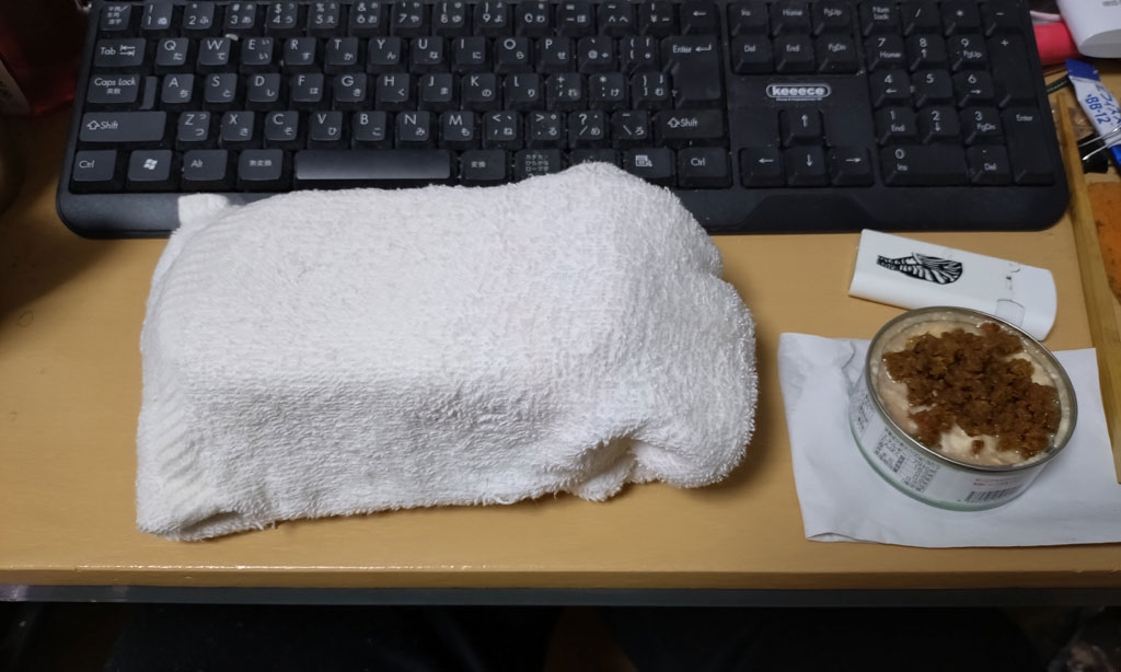 タオルをひいてみた…(サカナの缶詰も加熱する(笑))