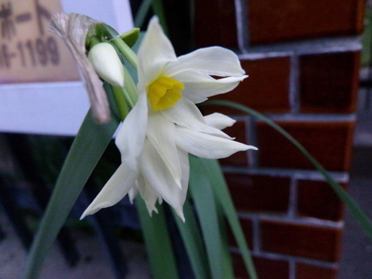GEDC9427     庭にスイセンが咲いていた… 小さな花だけど、次のツボミもできてる