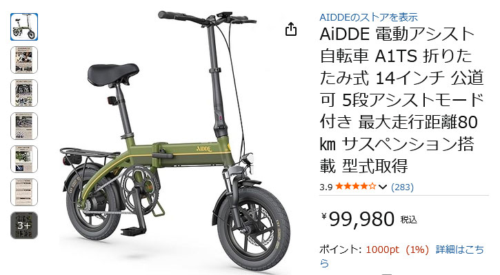 AiDDE 電動アシスト自転車 A1TS 折りたたみ式 14インチ 公道可 5段アシストモード付き 最大走行距離80㎞ サスペンション搭載 型式取得