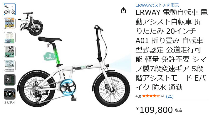 ERWAY 電動自転車 電動アシスト自転車 折りたたみ 20インチ A01 折り畳み 自転車 型式認定 公道走行可能 軽量 免許不要 シマノ製7段変速ギア 5段階アシストモード Eバイク 防水 通勤