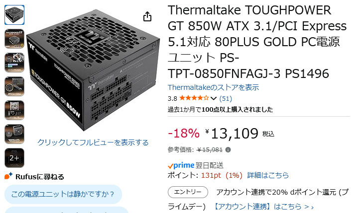 850Wを! 長年使う?つもりでいるので80PLUS GOLDだったらいいかな?ってことで…値段も高いけどね