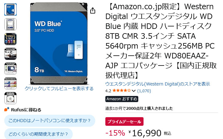 【Amazon.co.jp限定】Western Digital ウエスタンデジタル WD Blue 内蔵 HDD ハードディスク 8TB CMR 3.5インチ SATA 5640rpm キャッシュ256MB PC メーカー保証2年 WD80EAAZ-AJP エコパッケージ【国内正規取扱代理店】