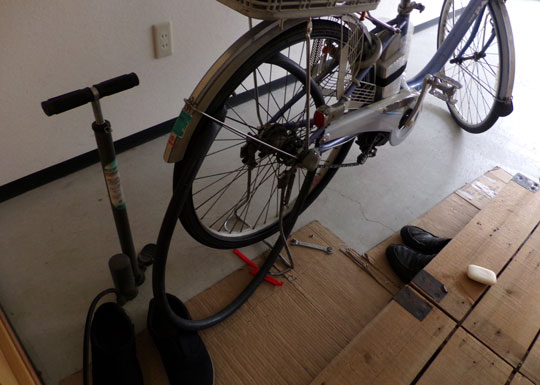 早速、後輪に空気を入れてみる。かすかに聞こえるシュー音