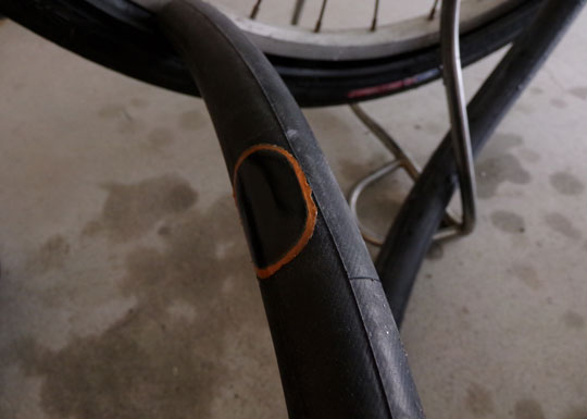 GEDC1276後輪は外すのが大変なんで、後輪をつけたままチューブの穴を探す。