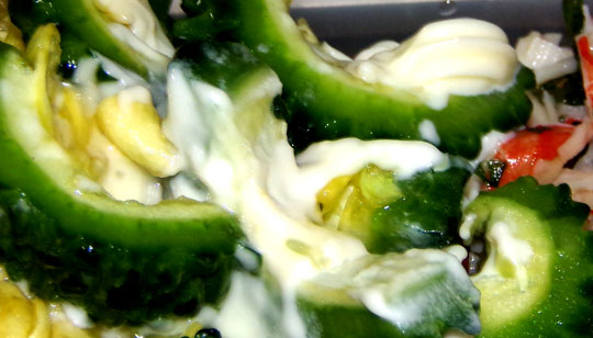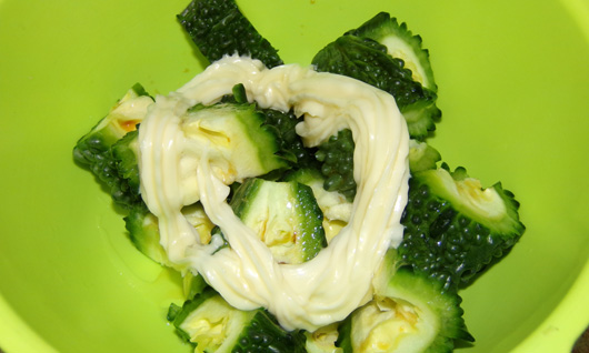 GEDC1946生ゴーヤにカニカマとシソの葉のみじん切りに甘酢、ちょっと甘味料と大量のマヨネーズ…