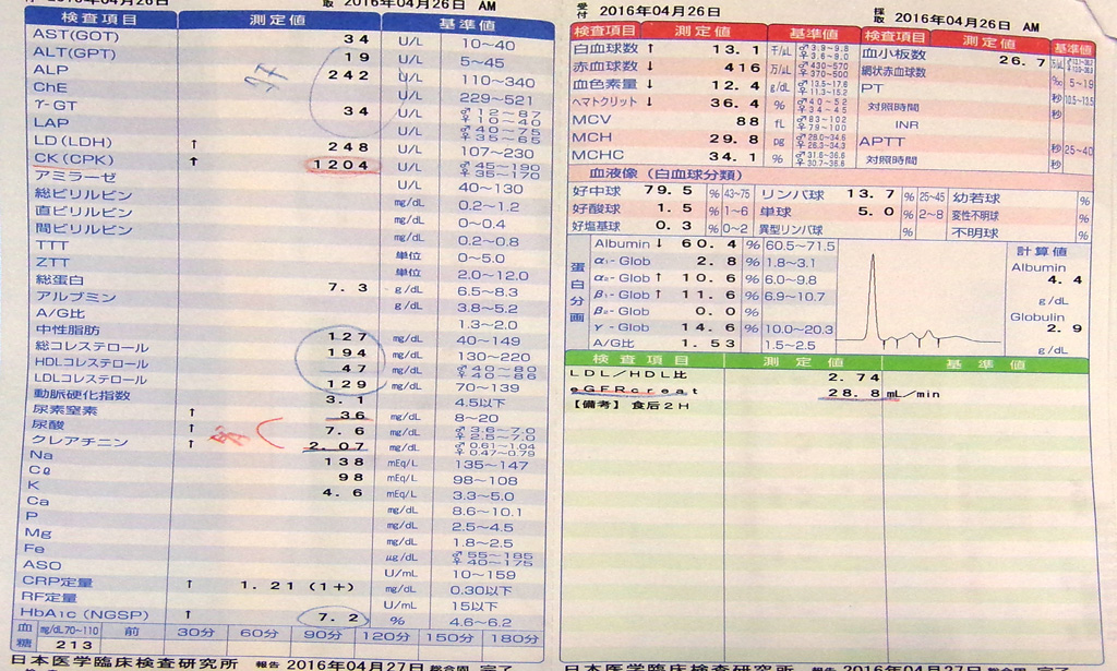 CK(CPK)が異常に高い… 基準45~190に対して1204と桁越え!