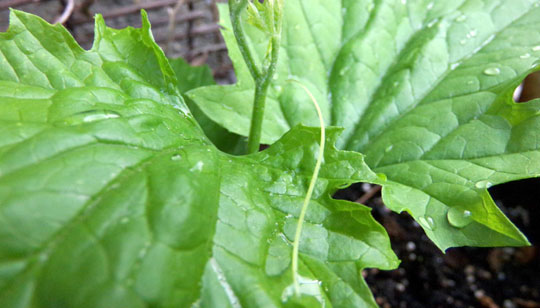 プランターのゴーヤも育ってきました。絡まるためのツタというかツルが出てきた。