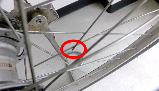 10本もリムが折れていると後輪の「たわみ」はひどく、加重が掛かっているときは強烈にぶれているんだろう…タイヤのゴムが泥よけを擦るぐらい…