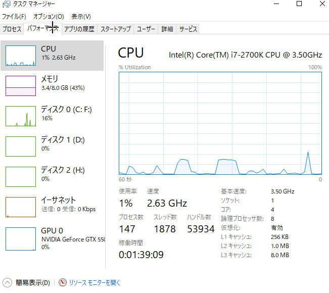 タスクマネージャーをクリックしてパフォーマンスタブをクリック