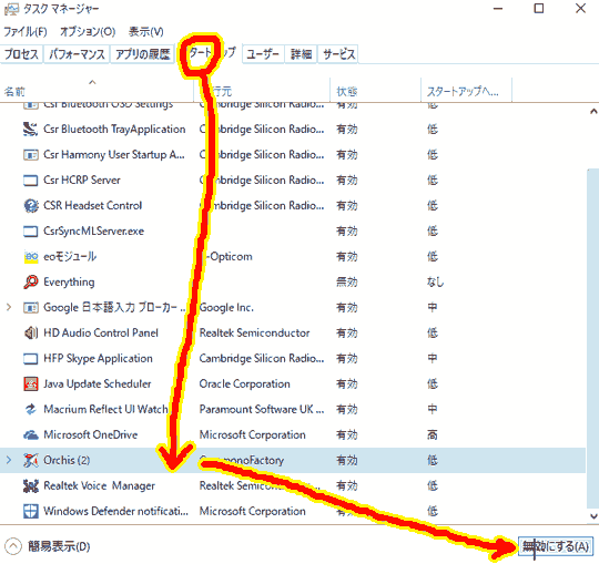 スタートアップタブをクリックし、常駐させるプログラムの有効を無効にします
