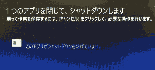 1.シャットダウンさせて、「このアプリが…」と出て「キャンセル」を選ぶか、少し待ってWindowsに戻ってくるのを待ちます…